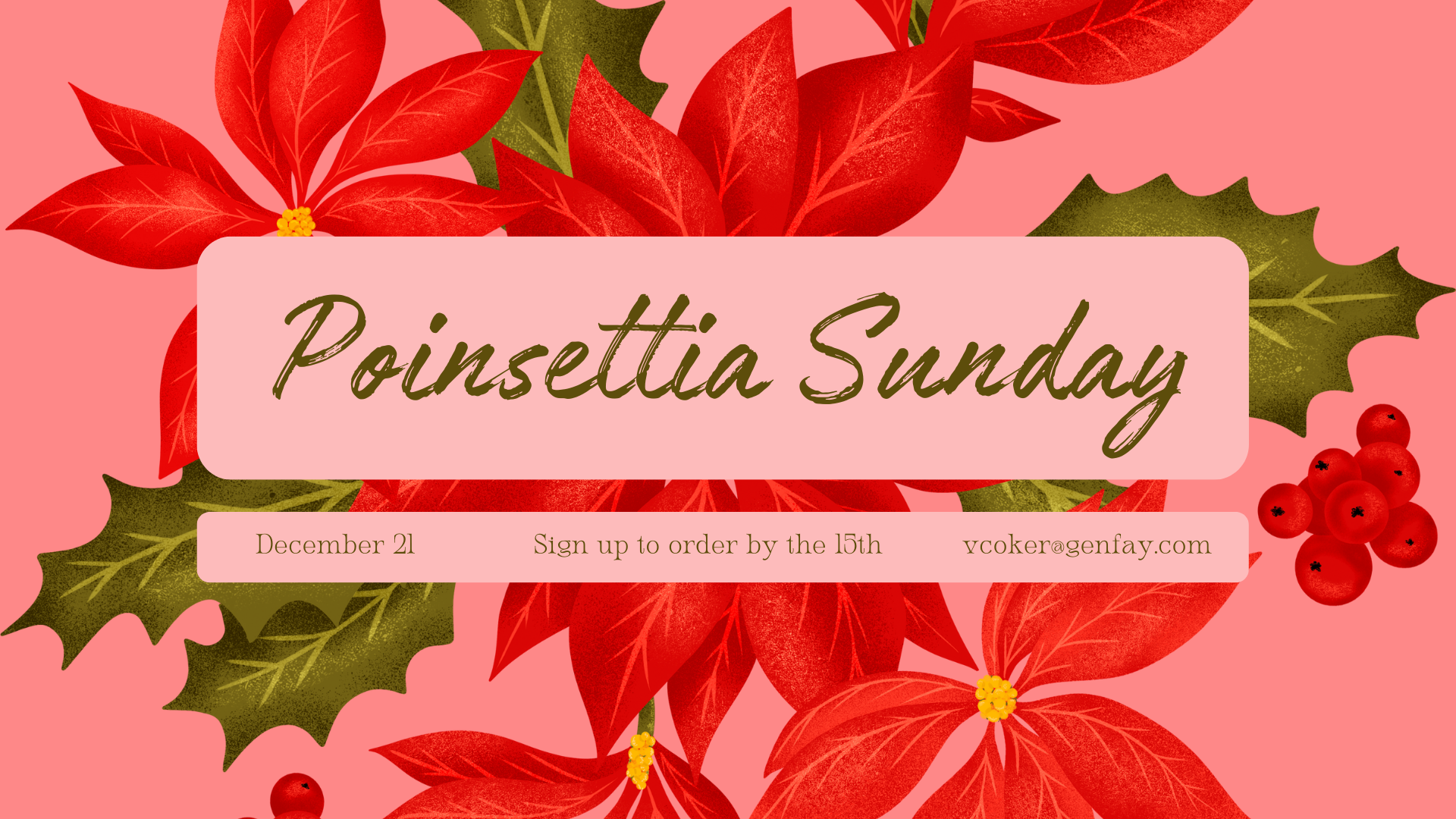 If you would like to purchase a poinsettia in honor or memory of a loved one, the cost is $18, and ordering is available by contacting Victoria Coker at vcoker@genfay.com or by noting on your connection card.