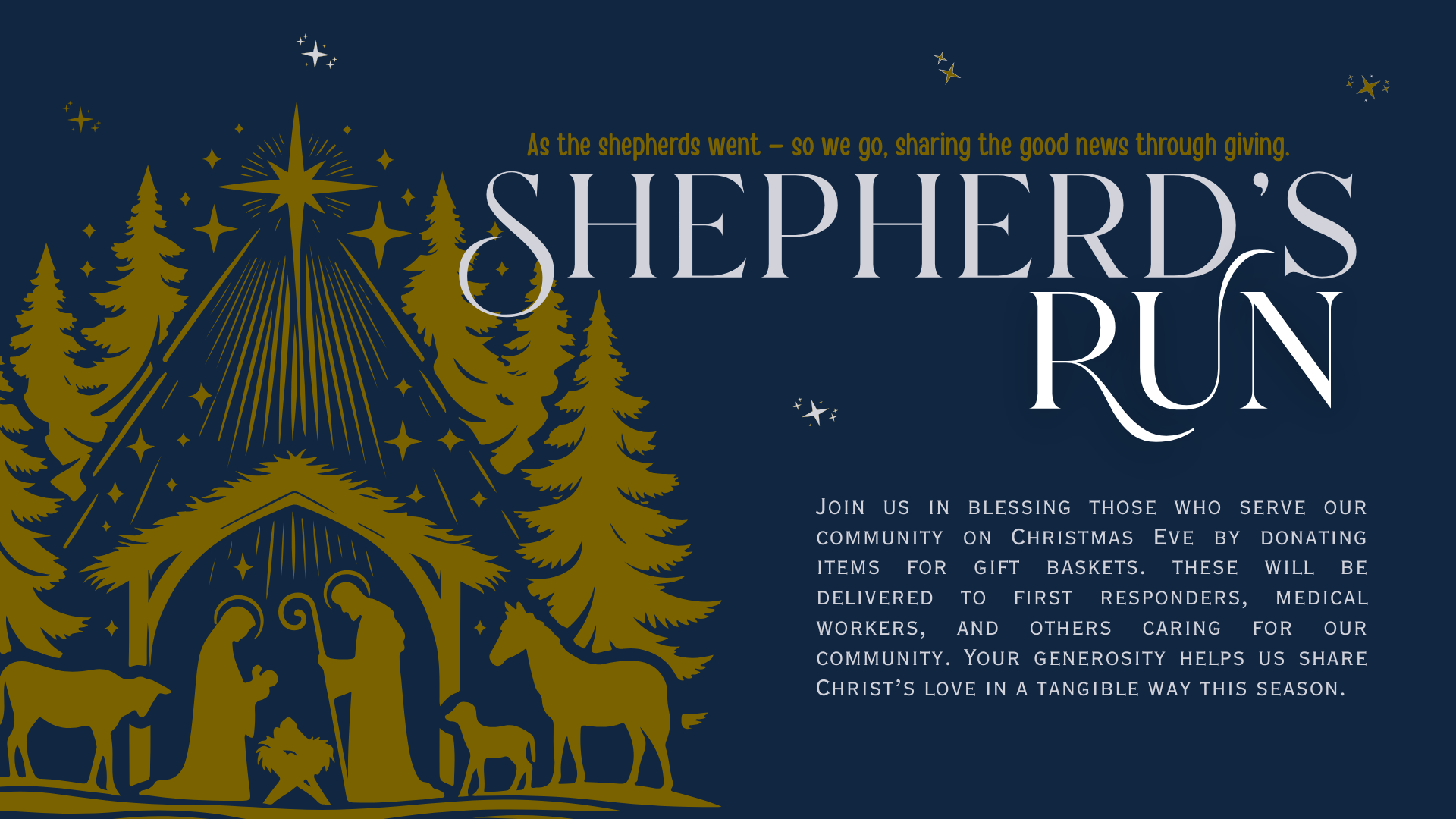 Join us in blessing those who serve our community on Christmas Eve by donating items for the gift baskets and/or by delivering them yourself. Your generosity helps us share Christ’s love in a tangible way this season.