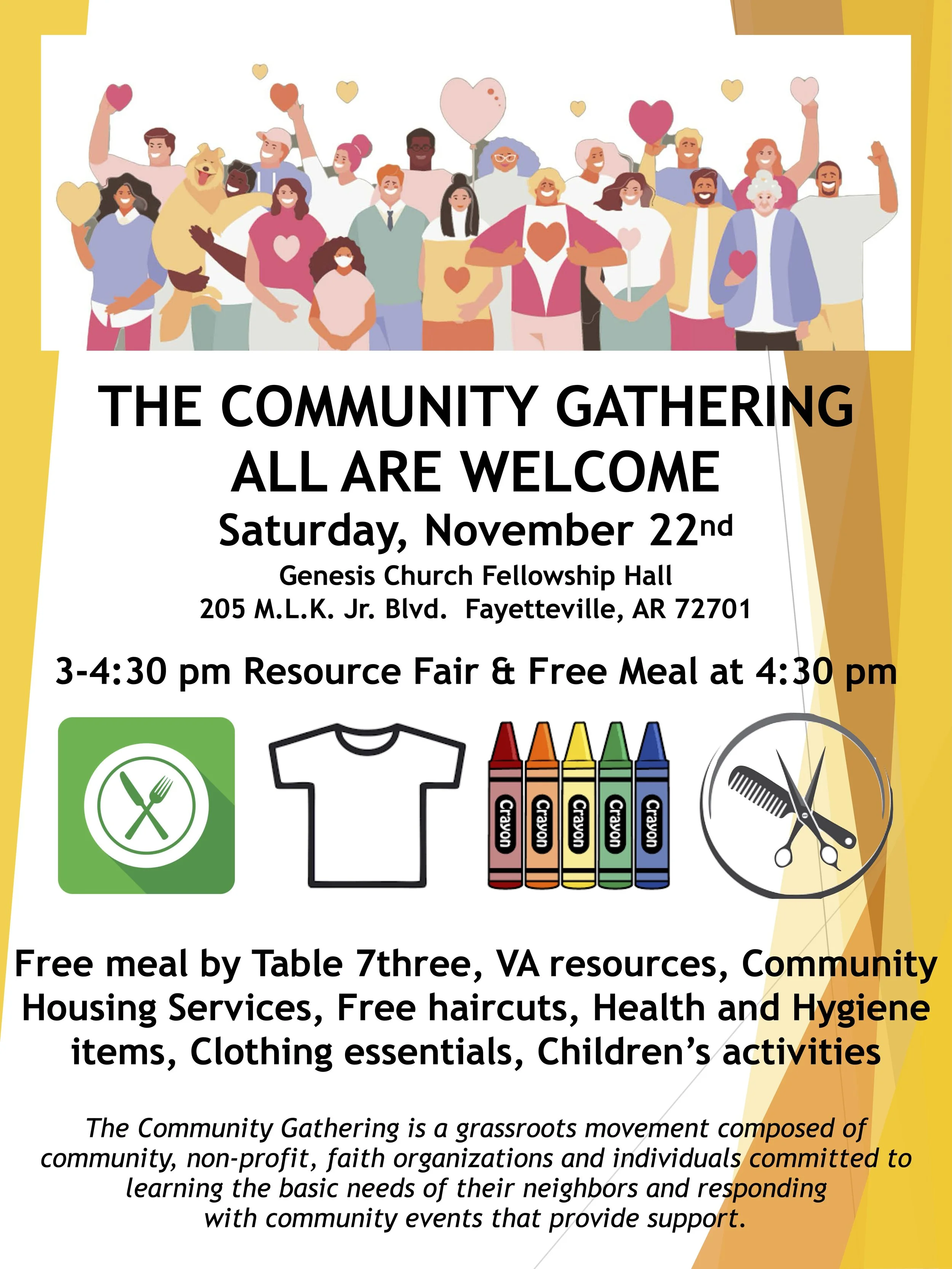 Join us at Genesis Church on November 22 where we will have a free meal by Table 7three, VA resources, community housing services, free haircuts, health and hygiene items, clothing essentials, children’s activities, and more.